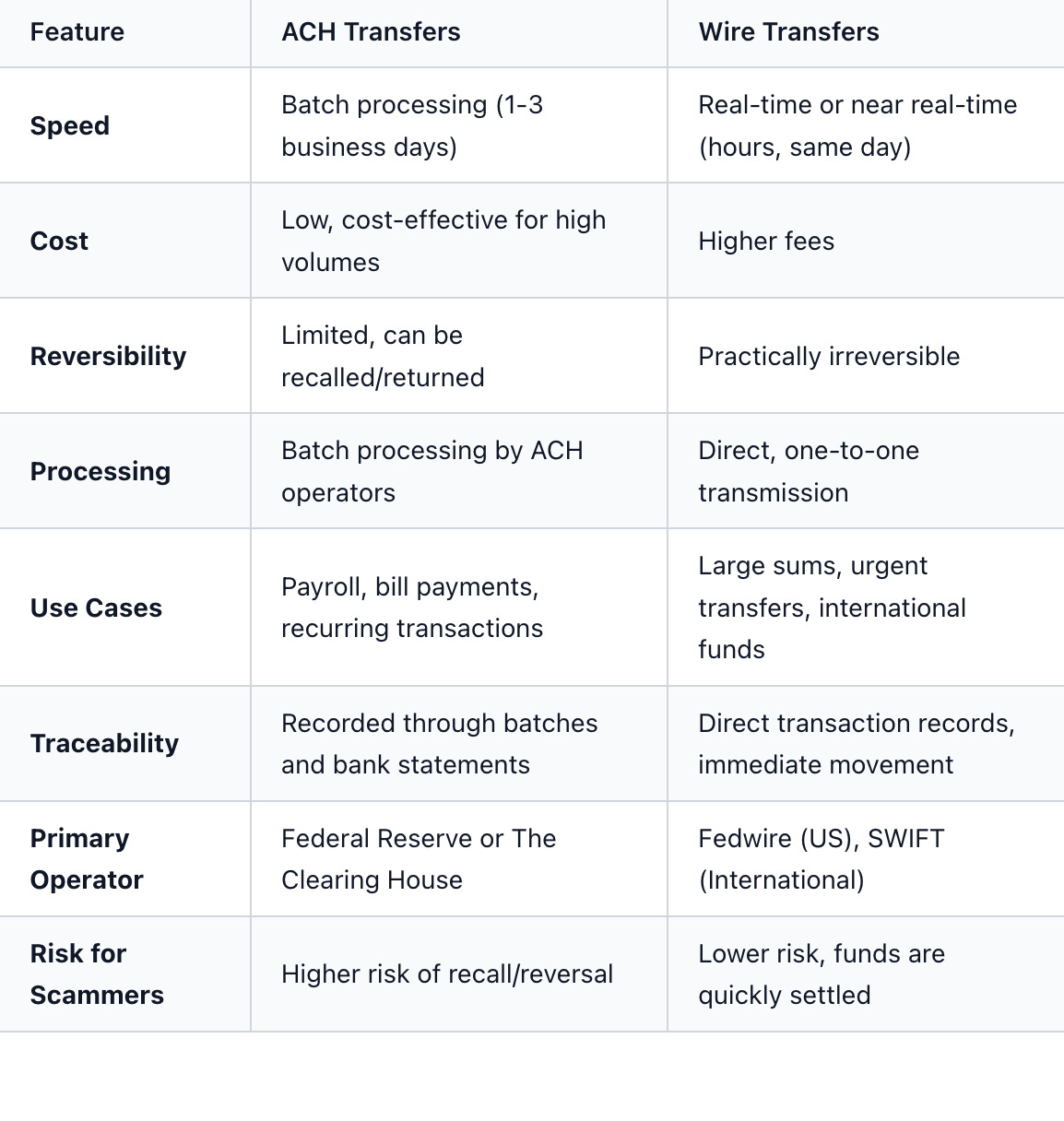 When specializing in internet-enabled financial crimes, understanding how money moves digitally is just as important as understanding how digital footprints are left. Two common methods criminals exploit are ACH payments and wire transfers. Although both transfer money electronically, their differences are significant, providing distinct benefits and drawbacks for both legitimate users and those with malicious intent.