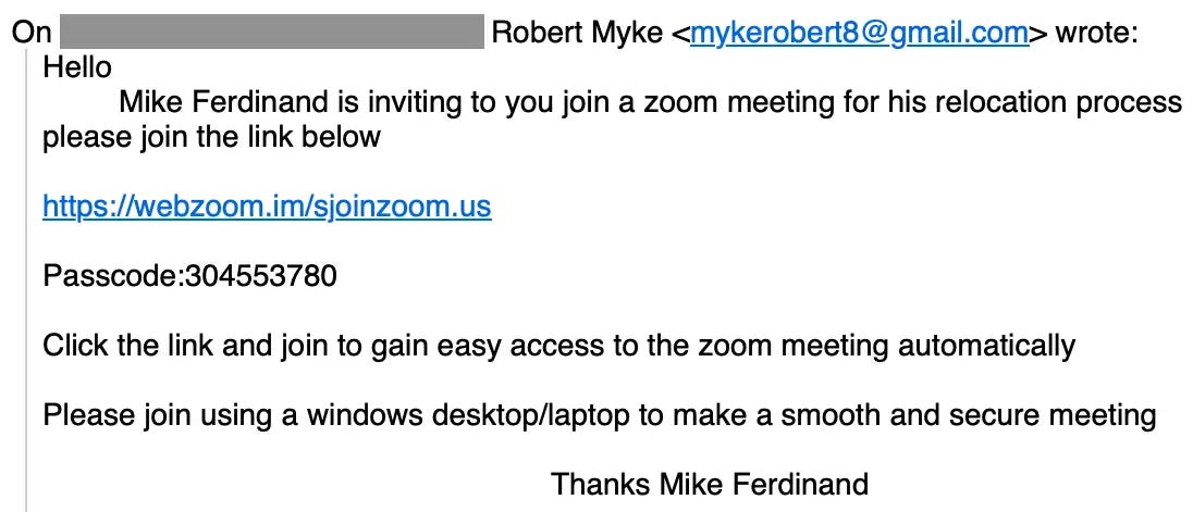 Sublime Security details a specific phishing scheme targeting real estate agents, where scammers impersonate prospective clients via contact forms or direct contact. They gradually earn the agents' trust through credible-sounding conversations, then deceive them into joining fake Zoom calls. These malicious “meeting links' often use lookalike domains such as webzoom[.]im instead of zoom[.]us, which download remote access tools like ScreenConnect, granting attackers control over the victim’s computer. This campaign is distinguished by its sophisticated social engineering tactics, including multi-message dialogues to build credibility before deploying malware. Additionally, the attackers prefer to host the meetings themselves rather than pass legitimate links to the agents.