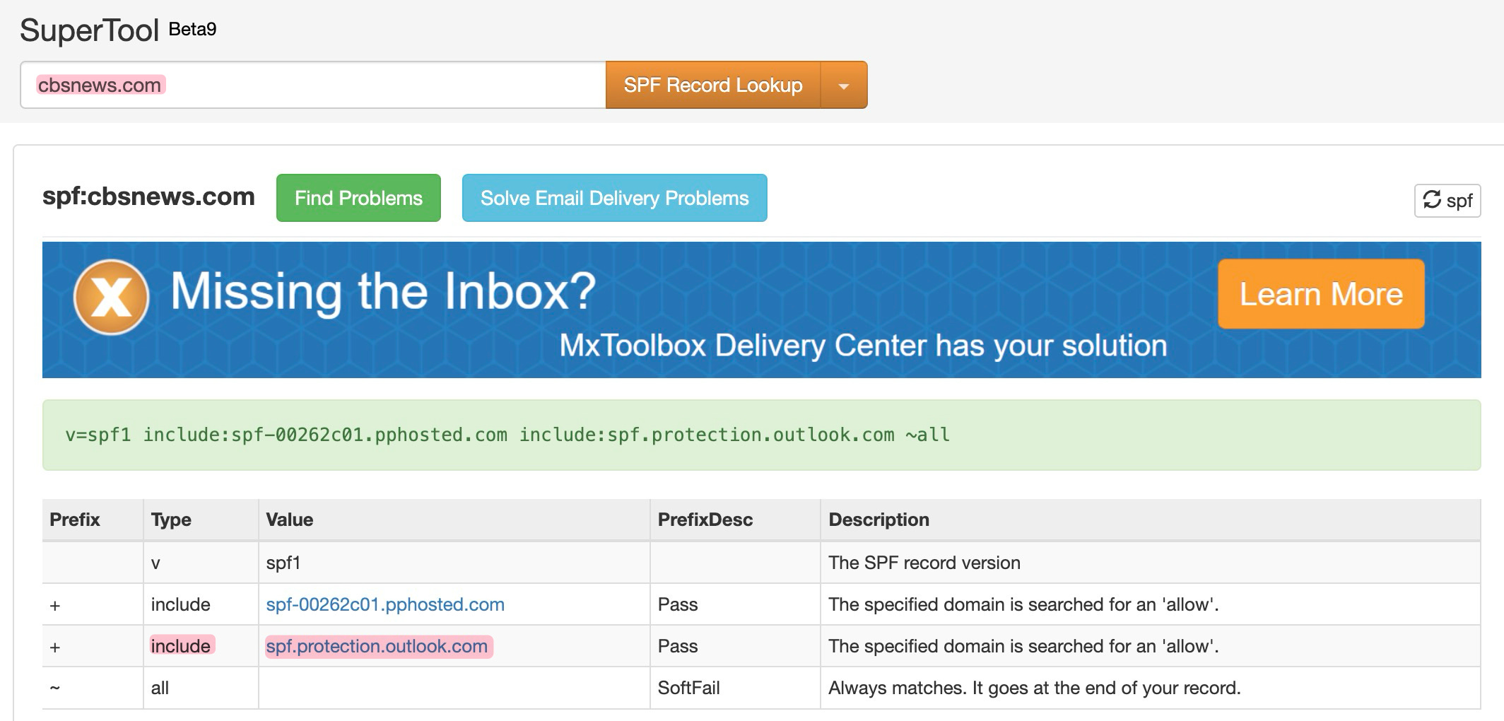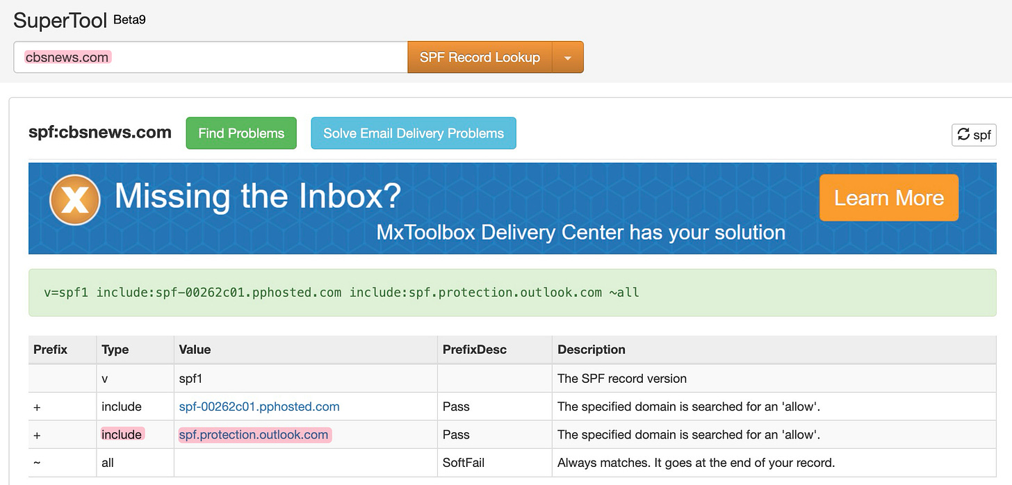 To check it, go back to MXToolbox, click the dropdown next to the search button, and select SPF Record Lookup. Enter the same domain and run the search. Although the results may look like a string of technical text, focus on entries starting with “include:”. These indicate external services trusted to send mail for the domain. For example, include:spf.protection.outlook.com suggests Microsoft 365, while include:_spf.google.com indicates Google Workspace — regardless of the MX record.
